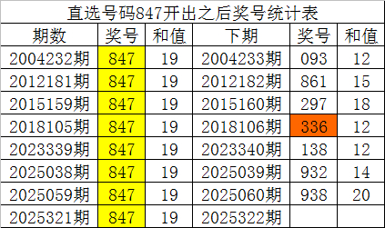 从以上统计不错看出,直选号码847出现之后,其下期奖号:1.下期全奇全偶组合莫得出现;2.下期全大全小组合莫得出现;3.下期0路号码出现概率100%;4.下期全质全合组合莫得出现;